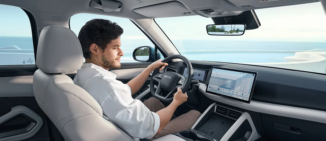 La plataforma Super DM de BYD optimiza el espacio de habitáculo del ATTO 2 DM-i, brindando un amplio espacio para cabezas y piernas tanto a los pasajeros delanteros como a los traseros.