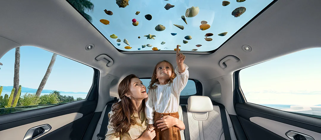 El BYD ATTO 2 DM-i, equipado con techo panorámico de cristal y toldo eléctrico, ofrece un espacio amplio y luminoso para que las caritas curiosas exploren. Transforma cada viaje en un parque infantil con vistas al cielo en movimiento.
